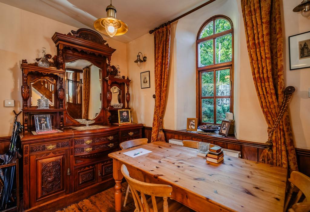 The dining area, set beneath a tall arched window, provides the perfect setting for formal entertaining or family gatherings, enjoying delightful views across the gardens.