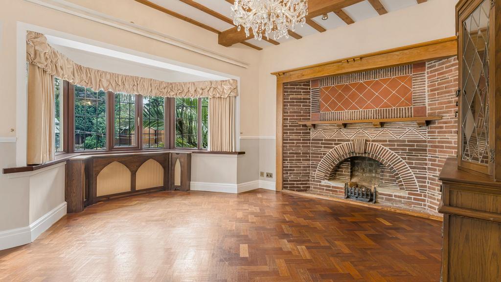 Lounge. Inglenook recess with corner windows and central marble fireplace with gas coal effect fire and timber surround. Deep decorative ceiling cornice with frieze and central rose. Parquet flooring, arched bay window to front and French doors to: