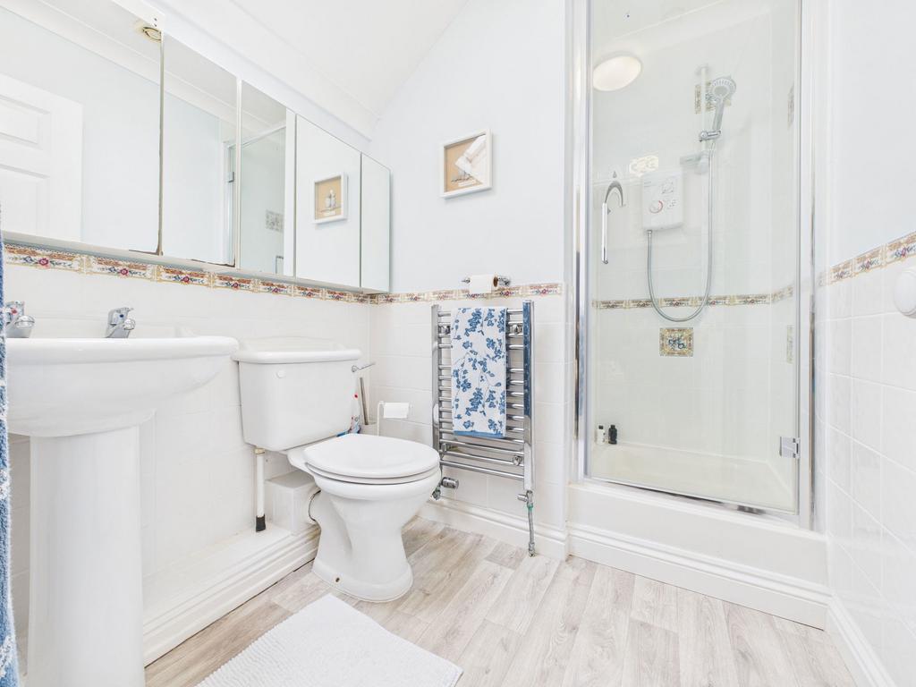 ENSUITE Shower cubicle with electric shower, pedestal wash hand basin, low level WC, half tiled, double glazing and heated towel rail.