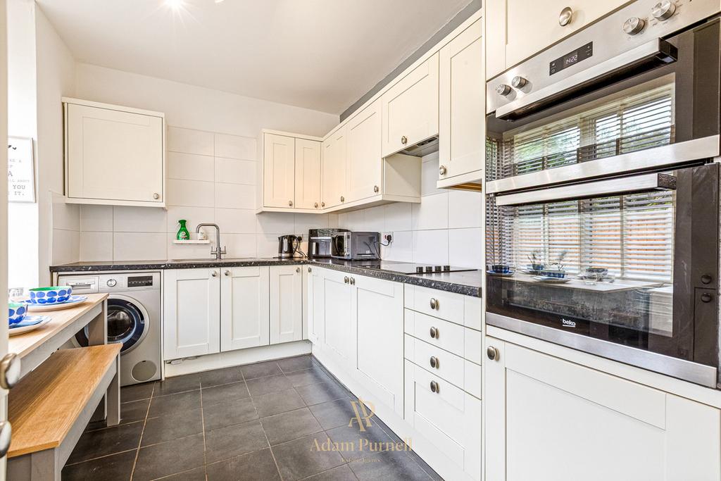 A Kitchen Made for Life: It's bright and welcoming, with a bay window framing a casual dining area. Sleek white cabinetry with black worktops, an eye level double oven, ceramic hob, stainless steel sink, and integrated appliances make cooking a pleasure. Adjacent is a utility area with space for laundry and direct access to the rear garden.