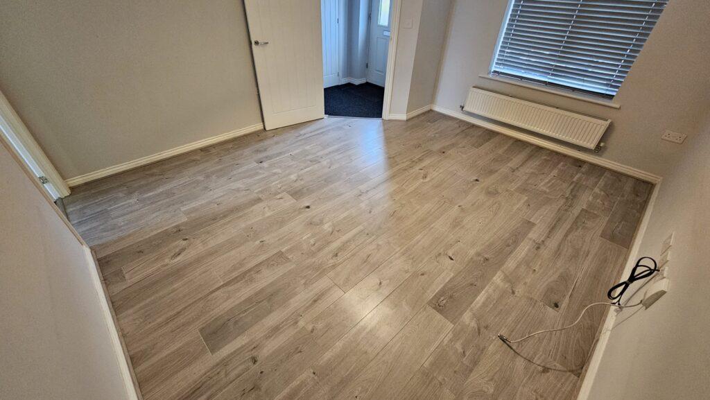 LIVING ROOM - As you enter the property via the entrance hall, to the left is the large living room with light grey wooden laminate flooring and light grey walls. With plenty of space for large furniture such as sofas and a TV, this room is perfect for relaxing and socialising. A large front-facing window fills the room with light.