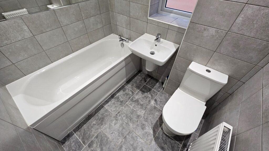 Bathroom 1: The main bathroom can be found on the first floor, fully tiled in grey. Included is a wash basin, W/C and bathtub, as well as a large mirror and frosted window.
