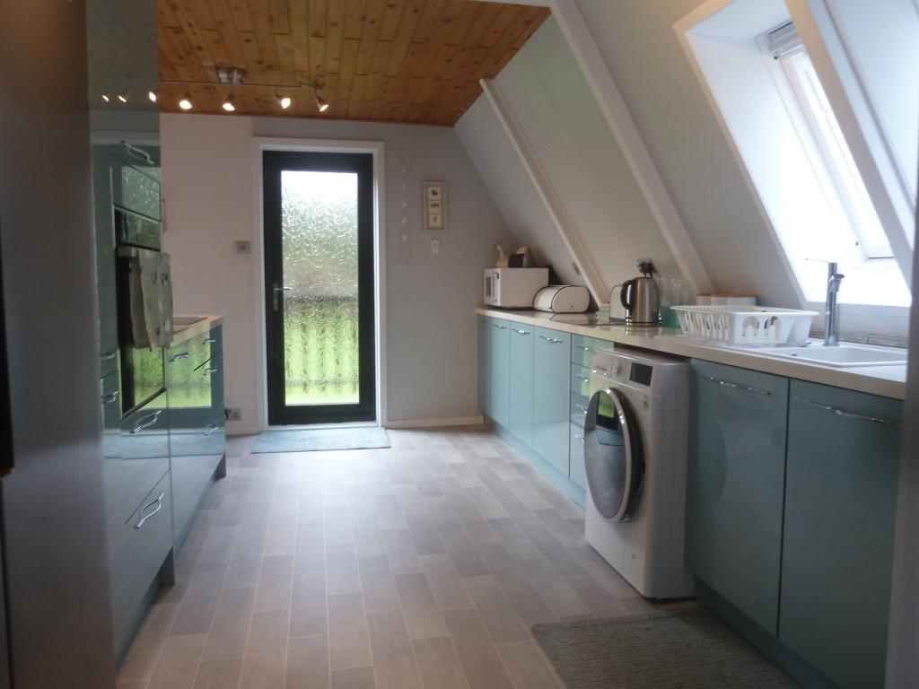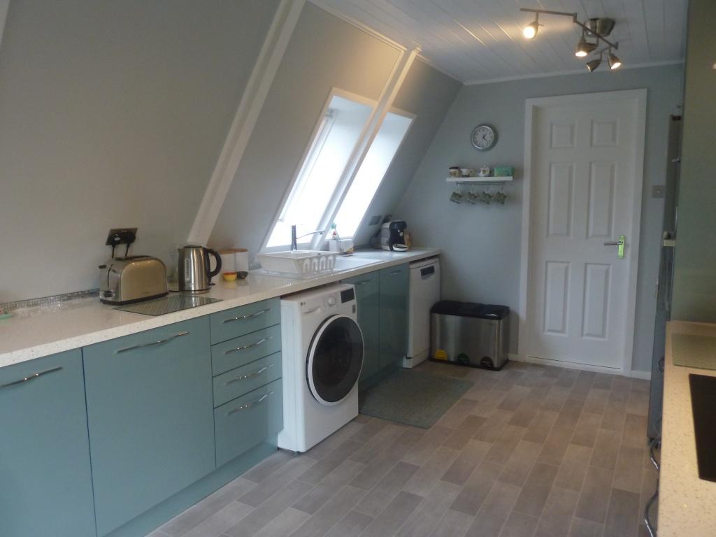 Beautiful modern fitted kitchen with matching base and wall units with contrasting worktops. Upright American style fridge freezer, washing machine and dish washer . Built-in electric oven at eye level . Ceramic hob, Sink with mixer taps and side drainer. Double glazed door to the back leads to a outside patio area. High grade tile effect vinyl flooring. a second door leads back to the hall. Spot lights .