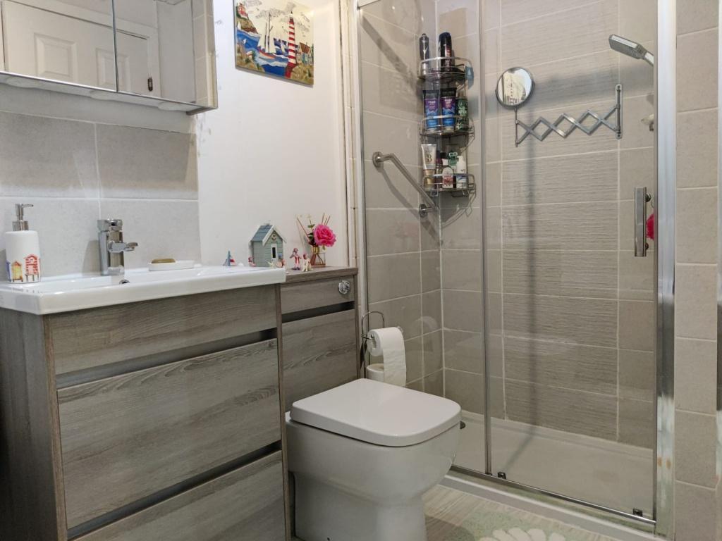 Corner shower enclosure with electric shower. Wall mounted panel heater. Wet wall panelling to one side .Quality wood effect flooring . Recessed LED lighting . Extractor fan.