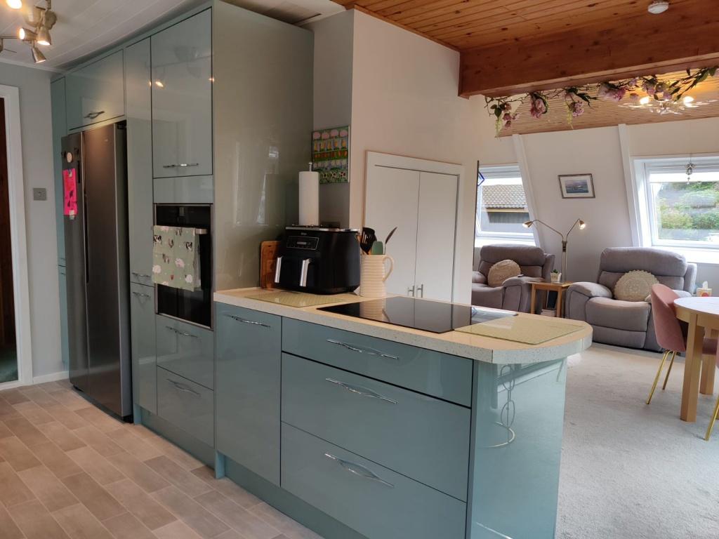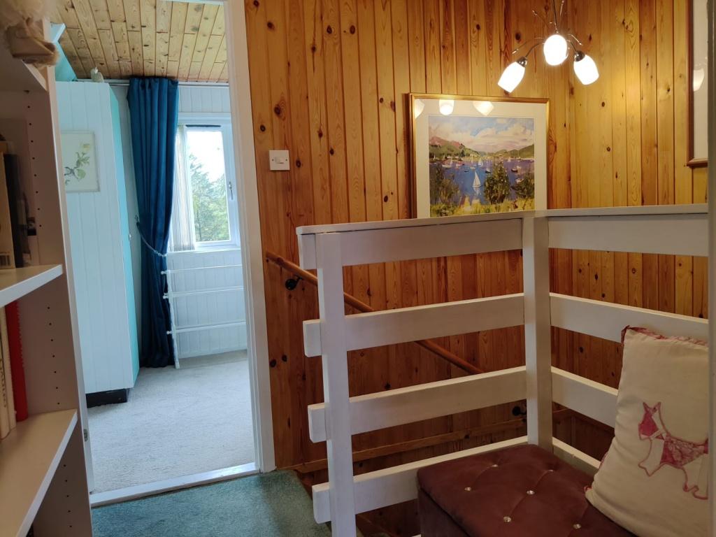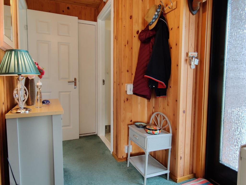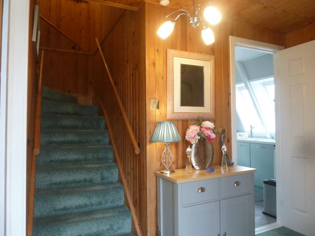 Enter from the front decking via doubled glazed door with privacy glass into the bright and welcoming hall. Stairs lead up to the two bedrooms. Large storage cupboard which houses the fuse box, meter and the pressurized hot water storage tank. Access to the lounge, kitchen and downstairs bathroom. Wall mounted panel heater. Carpeted.