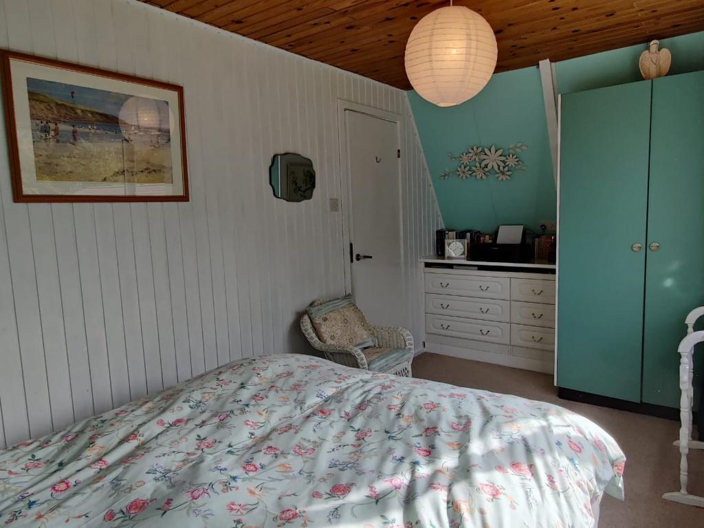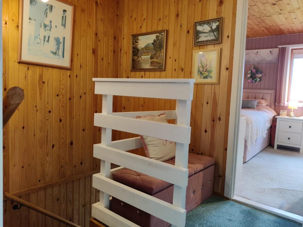 Double bedroom large double glazed window to the side . Wood panel Wall s and pine wood ceiling . Pendant light wall mounted panel heater. Fitted wardrobe with shelving and hanging rails. Built-in drawers with fixed shelve above . Carpeted.