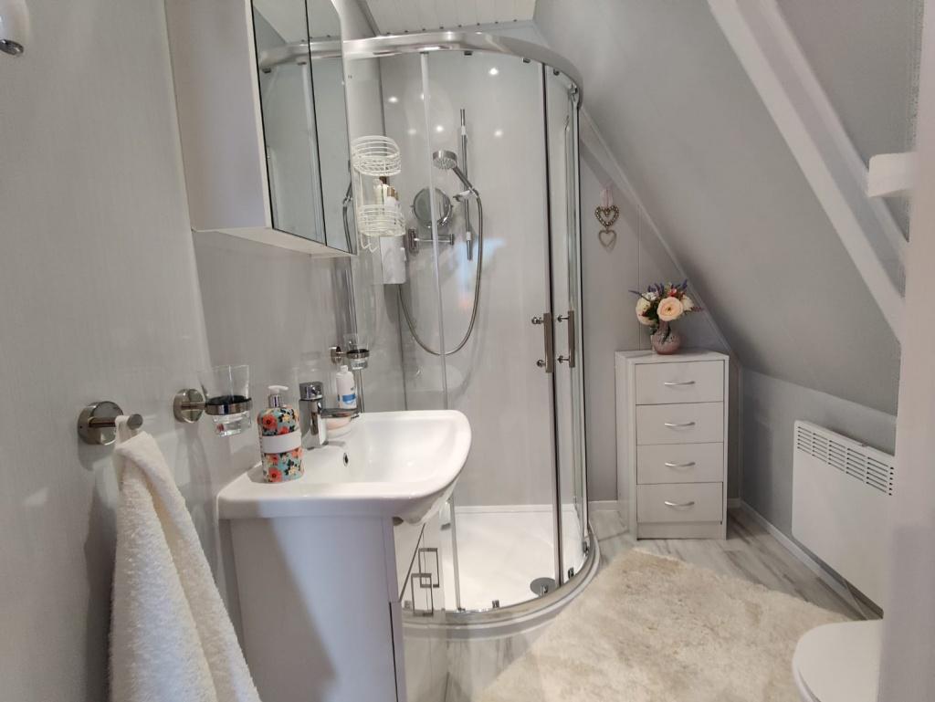 Private allocated parking , Patio are off the back door , Decking to the front with partial sea views. There is also a large wood storage shed with lighting and electric sockets. Outside water tap.
