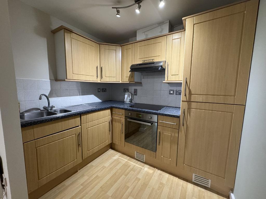 The apartment features a bright open-plan living space, a fitted kitchen with integrated appliances, and a spacious double bedroom with ample storage within a built-in wardrobe.
