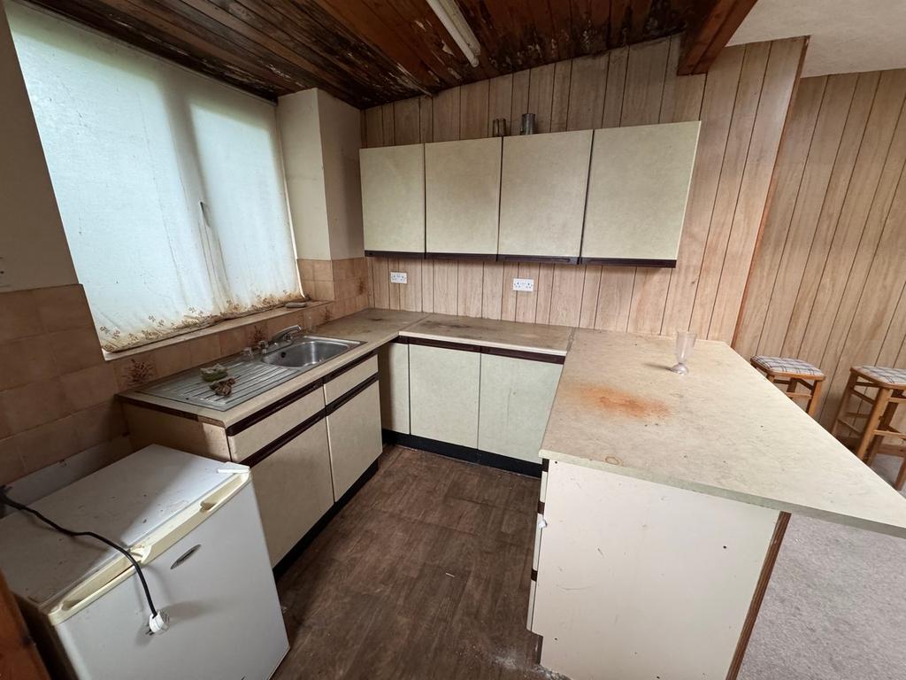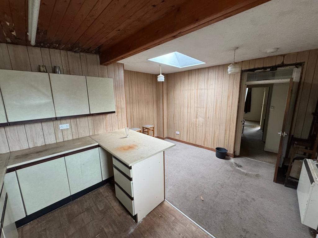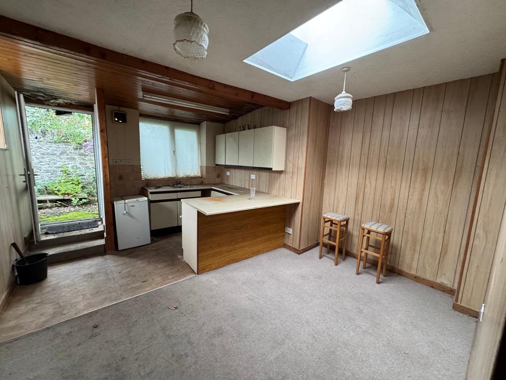 15' 2" x 13' 2" (4.62m x 4.01m) with a range of base and wall cupboard units, single stainless steel drainer with mixer tap, rear window, skylight over, space for dining table, heater and rear door to courtyard.