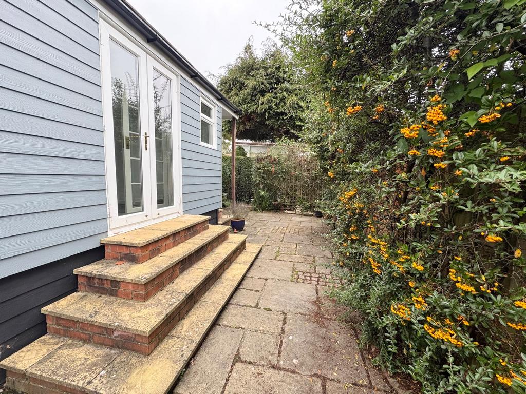 Surround the unit and are enclosed with the main area being laid to patio. Flowering shrubs and plants. Tap. Shed, cupboard housing gas bottles.
