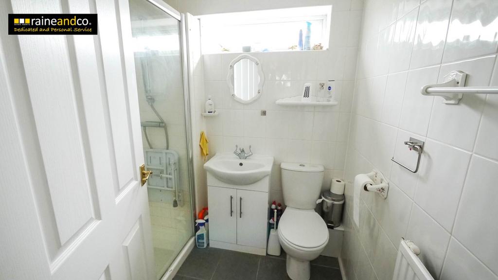 Suite comprising shower enclosure with sliding door, low level wc, wall mounted shower, fully tiled walls and floor, radiator, and double glazed window to front.