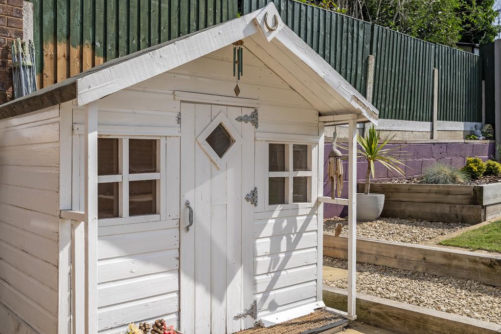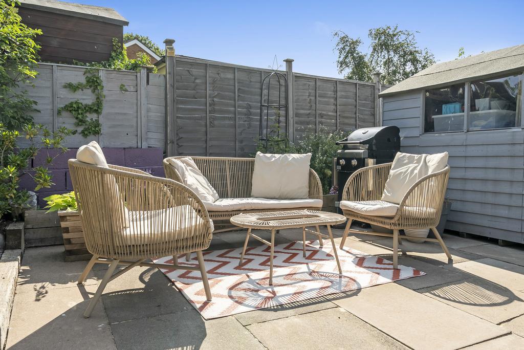 From here, step straight out into the generous rear garden, where a lawned area and secluded seating spot towards the back invite you to enjoy summer BBQs, a morning coffee, or some peaceful downtime.