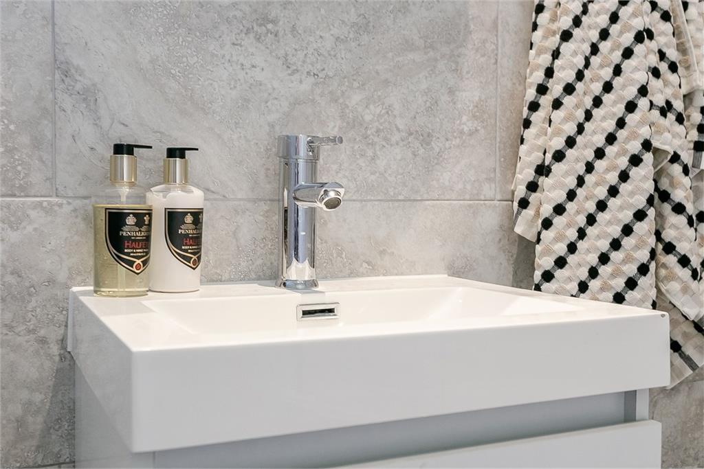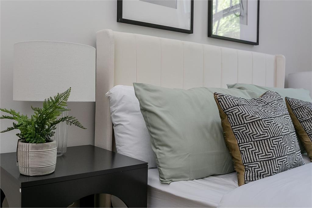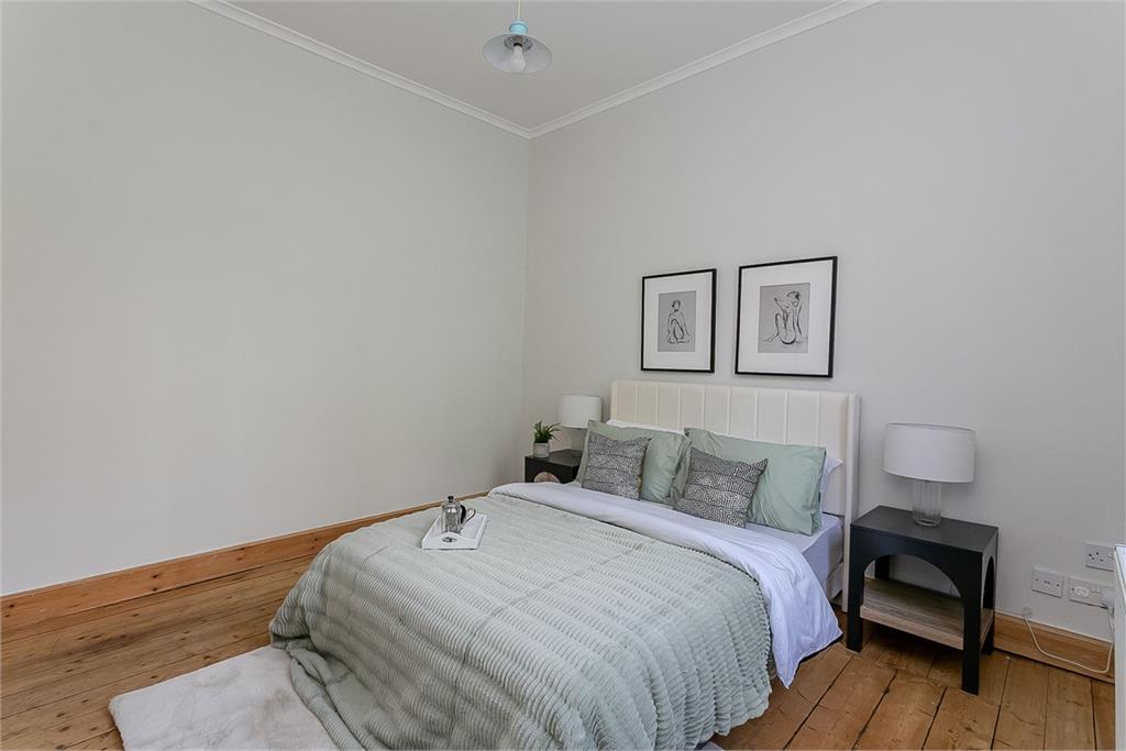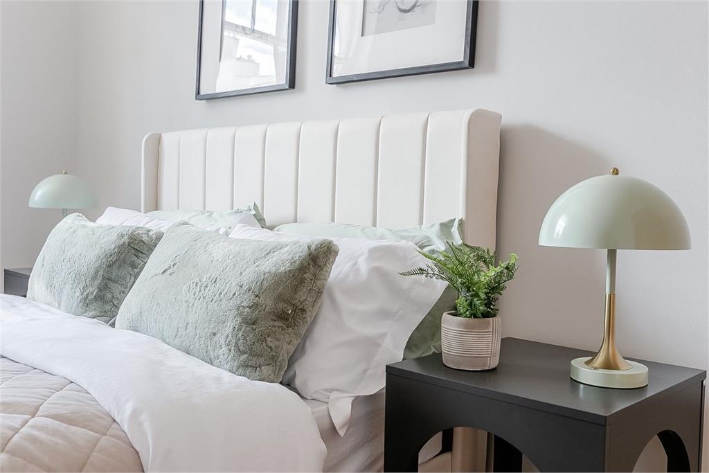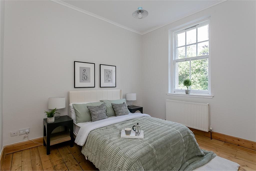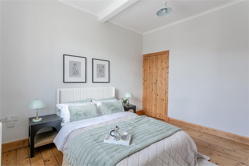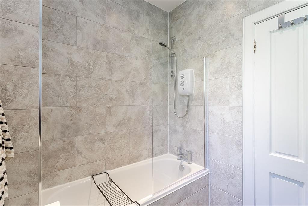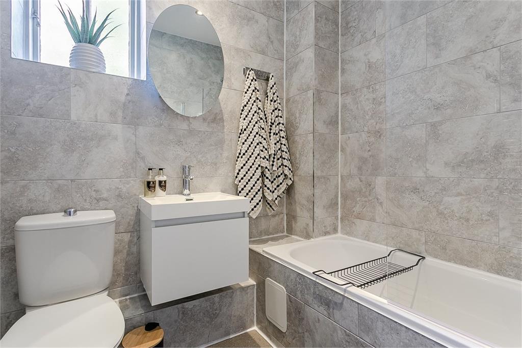 Two well-proportioned bedrooms are finished with varnished wooden flooring and light, neutral decor, providing versatile spaces for use as sleeping accommodation, a home office, or guest rooms. Completing the property, the stylish three-piece bathroom features a tiled splashback surround, a shower over the bath, recessed spotlighting, and a modern ladder-style radiator.