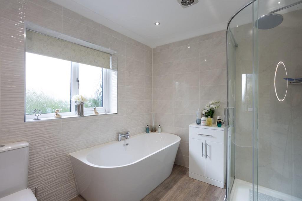 The family bathroom is luxuriously appointed with a contemporary white suite, including a large double-ended bath, vanity washbasin, shower enclosure, and low flush WC. Thoughtful details such as a heated towel rail, built-in storage, and ambient downlighting enhance the spa-like atmosphere.