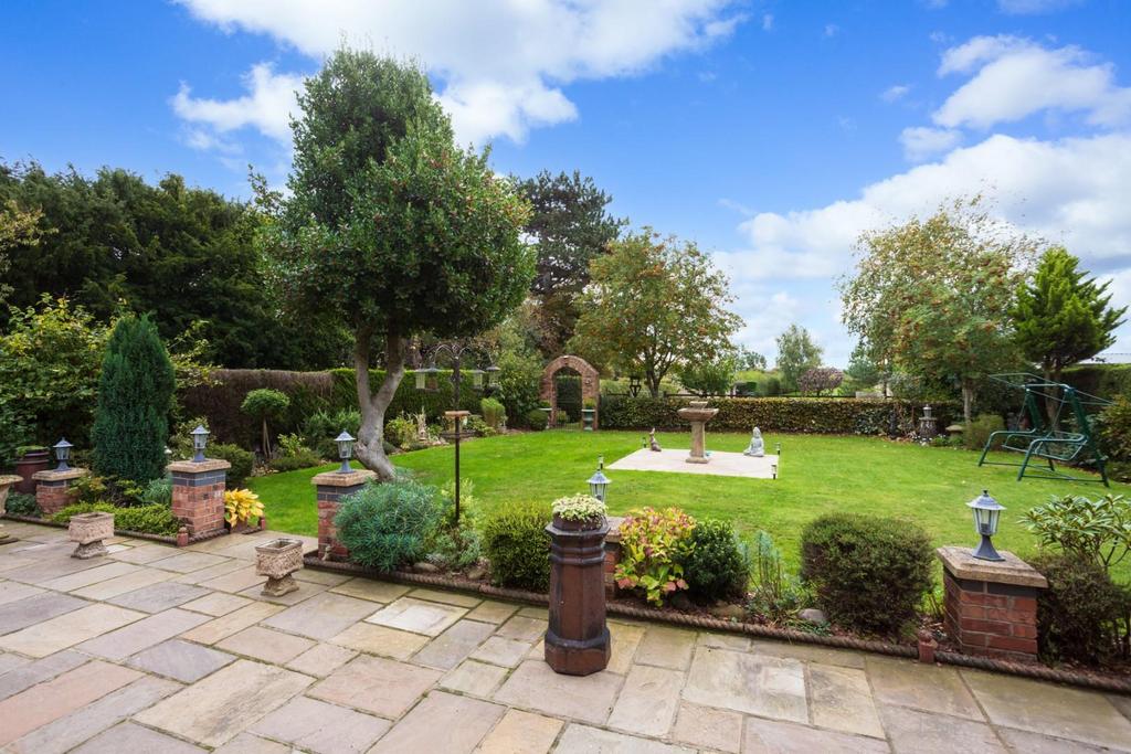 The landscaped gardens surrounding the property have been meticulously designed and maintained. The front garden features an elegant water feature and raised flower beds, while the rear garden opens to expansive lawns bordered by mature planting and extensive patio areas perfect for outdoor entertaining. Beyond the gardens lie two well-kept grass paddocks, ideal for grazing or recreational use, with vehicle access. Together, the grounds extend to approximately one acre, offering both beauty and practicality in equal measure.