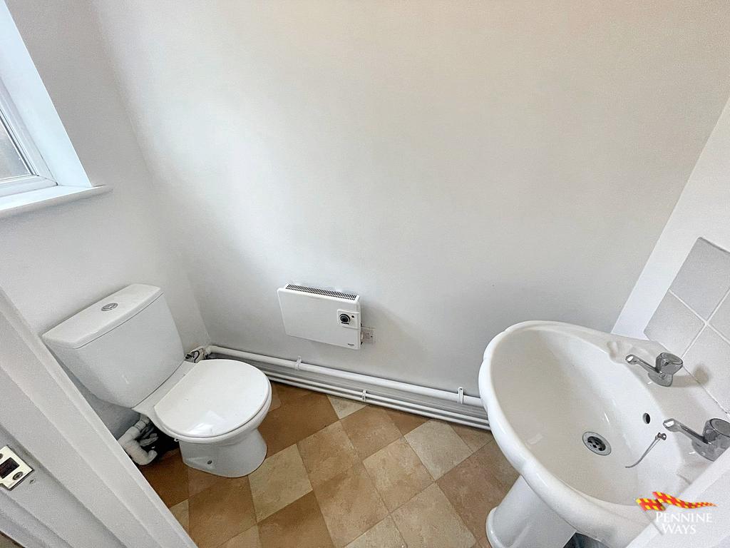 Downstairs WC with low level WC, pedestal sink, splashback tiles, electric wall heater, vinyl flooring and UPVC double glazed window.