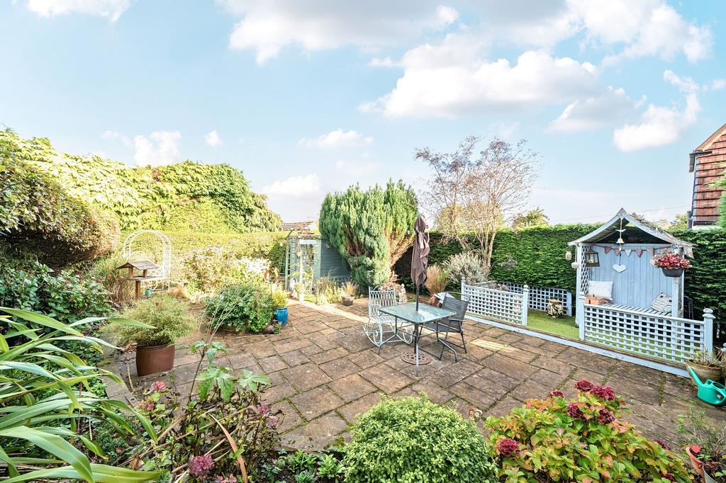 The private rear garden is mainly laid to patio with a section of lawn, bordered by hedges and featuring a useful wooden shed — perfect for outdoor dining or relaxing.