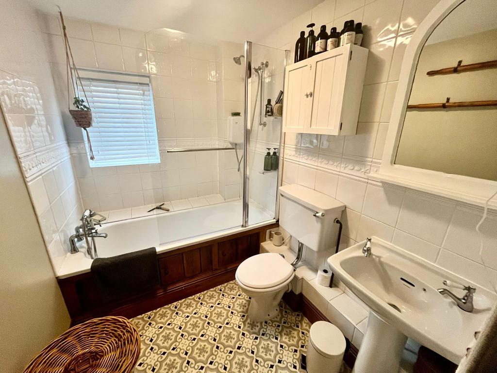 Suite comprising bath, shower over, low level WC, wash hand basin, shaver point, airing cupboard double glazed window to rear.