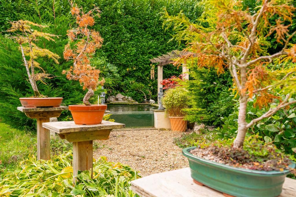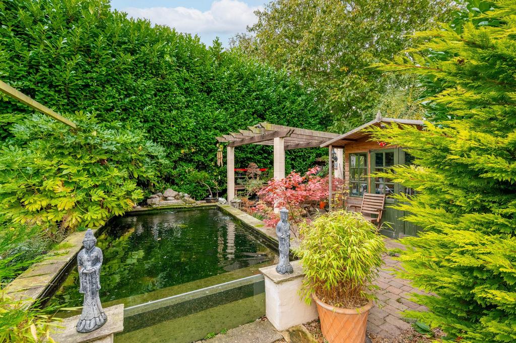 To the side and rear, the gardens unfold into distinct areas that include manicured lawns, established borders, and a charming fruit garden currently yielding apples, pears, raspberries, cherries, and plums. A bonsai-inspired seating space with a pergola and koi pond provides a serene retreat, while a covered paved area offers the ideal setting for outdoor dining and entertaining. The garden also features a decorative well with viewing glass and internal lighting, along with an outdoor water pump that adds unique character to the setting.