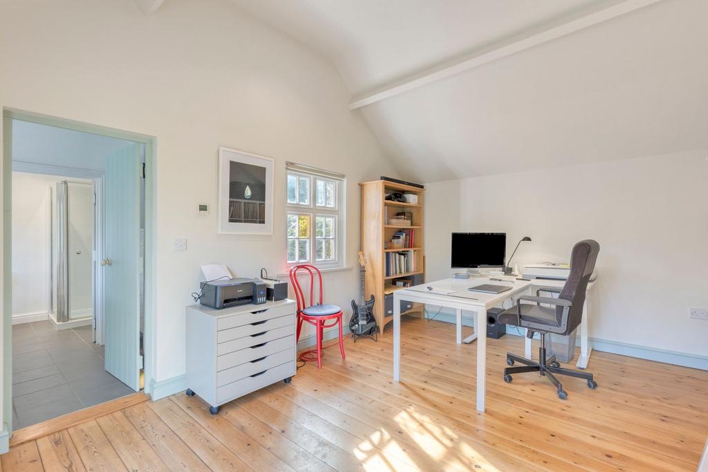 The kitchen has been tastefully refitted with a stylish range of units and modern appliances, combining functionality with contemporary design. It offers a bright and sociable space, ideal for everyday living, with views overlooking the garden. Recent improvements include double-glazed windows, a new electric boiler, and traditional-style radiators, ensuring that the property’s historic character is matched by modern convenience.