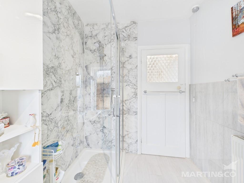 BATHROOM 7' 7" x 6' 6" (2.31m x 1.98m) Obscure double glazed window to side aspect. Low level WC. Pedestal wash hand basin. Walk in double shower unit with shower attachment. Wall mounted radiator.