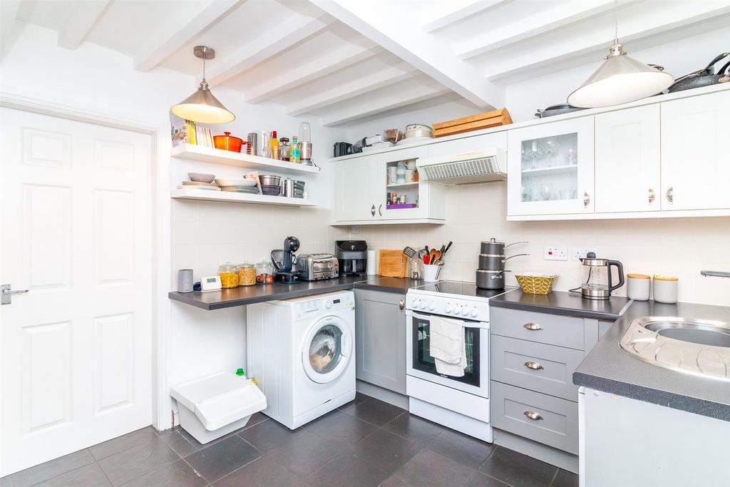 The kitchen has a range of wall, drawer and base units, a stainless steel sink and drainer unit with a mixer tap over, space and plumbing for a washing machine, space for a fridge, space for a freezer, plus a built in electric oven, and a built in gas hob with an extractor hood over. There is a window to the front, open stairs rising to the first floor, an under stairs storage, and a door opening to the lounge.