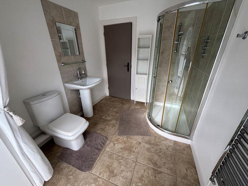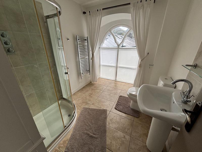 Conservation roof light to side, wash basin, w c, shower cubicle, part tiled walls, tiled floor, heated towel rail, extractor.
