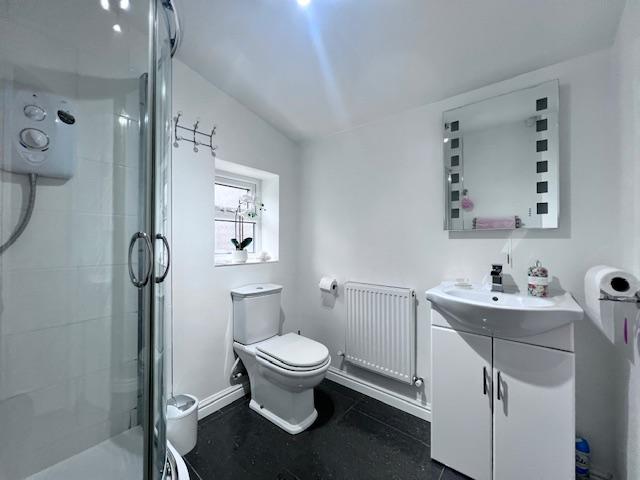 Shower Room - 1.90 x 2.05 (6'2" x 6'8") - Having a tiled floor, glass panelled quadrant shower enclosure with a Mira electric shower and low voltage extra fan over, low-level WC, wash hand basin with mono tap over with vanity unit below, central heating radiator, chrome heated towel rail, Ceiling light point, UPVC double glazed window with obscure glass to rear