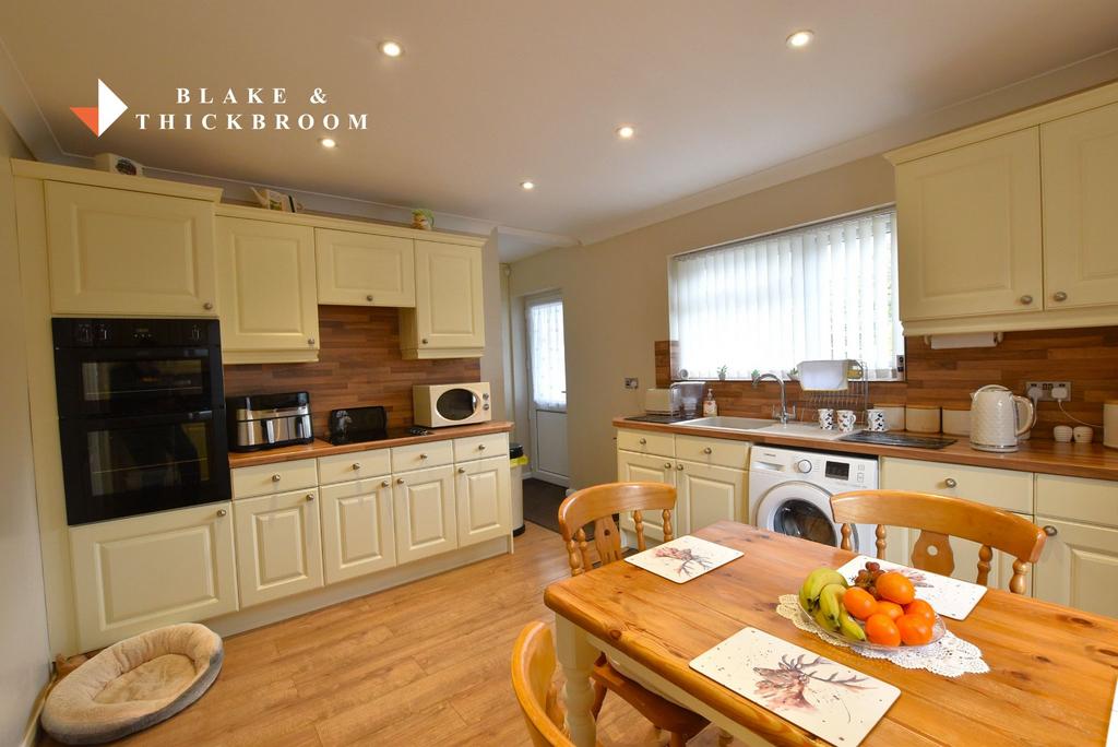 Well appointed with a range of cream coloured laminated fronted units comprising laminated work surfaces with inset single drainer sink unit with mixer tap. Cupboards under, eye level cupboards. Inset electric hob unit, extractor hood above. Built in double oven with cupboard storage above and below. Integrated fridge and freezer. Radiator, down lighters, airing cupboard. Laminated wood flooring, cupboard housing gas boiler. Windows to side and rear. Double glazed door to outside lobby.