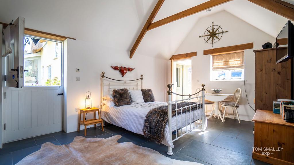 The barn conversion provides a self-contained suite, comprising a generous bedroom/living area and a large bathroom with roll-top bath, WC, wash basin, and separate mains shower—an indulgent and versatile retreat.