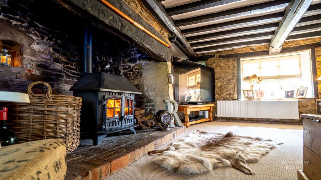 The spacious ground floor flows seamlessly, featuring a welcoming lounge with an impressive inglenook fireplace and wood-burning stove, open-plan dining area, charming garden room, a well-fitted kitchen, and porch with access to the garden and barn conversion.