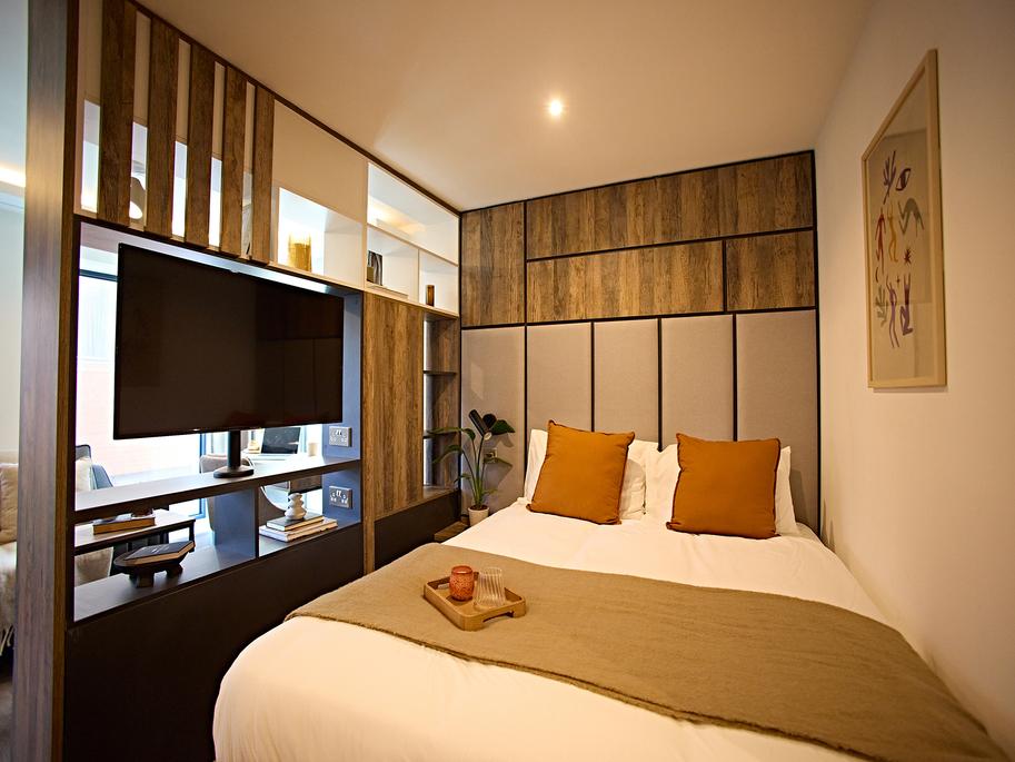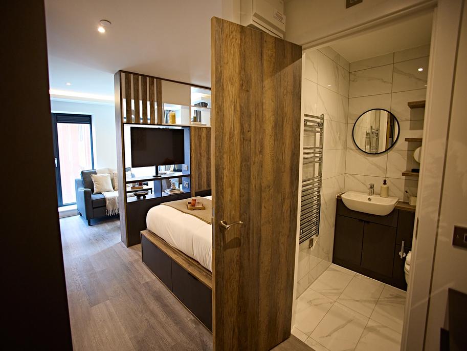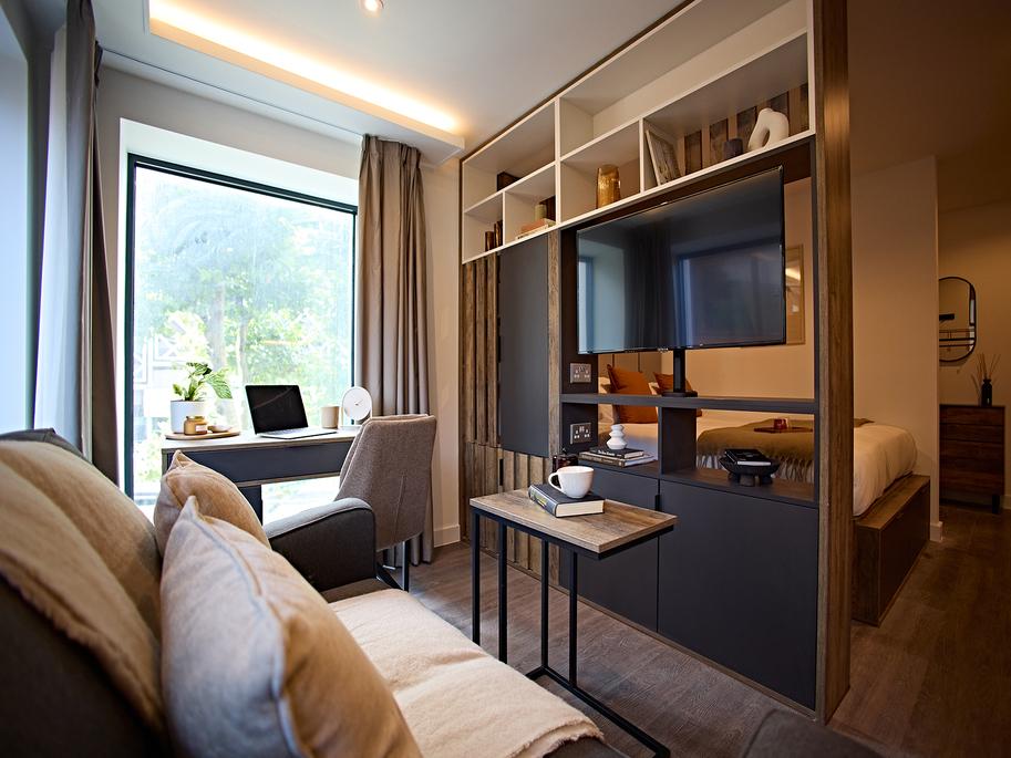 Each fully furnished studio apartment features a spacious double bed with underbed storage, a bedside table, a wardrobe, wood featured shelving throughout and a study desk with chair - ideal for studying or unwinding after lectures.
