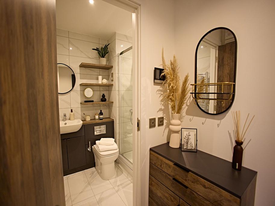 The contemporary bathroom is fully tiled and includes sleek fittings, a deluxe sized rainfall shower with separate handheld attachment, integrated storage, and a heated towel rail.