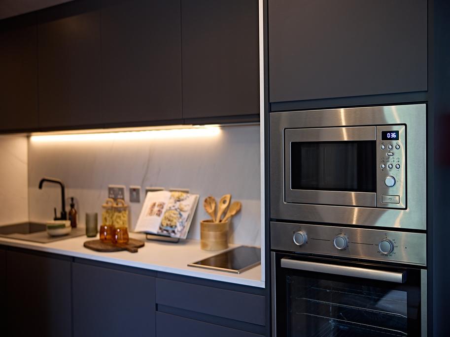 The open-plan kitchen is equipped with a touch-control two-ring induction hob, oven, integrated microwave, washer-dryer, and fridge with freezer compartment. The living area includes wood-effect shelving, a coffee table, a two-seater sofa, and a 360° rotating smart TV - perfect for relaxing in your own space.