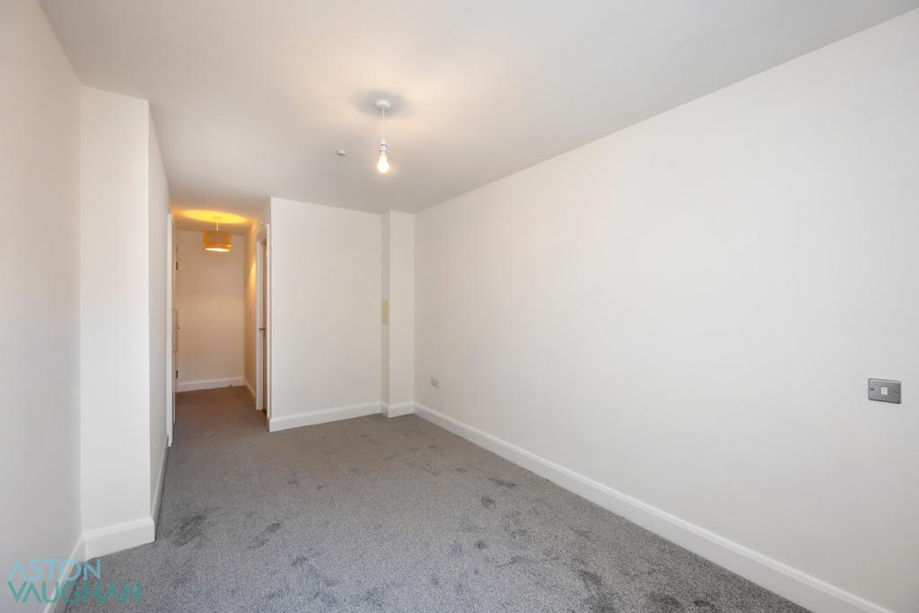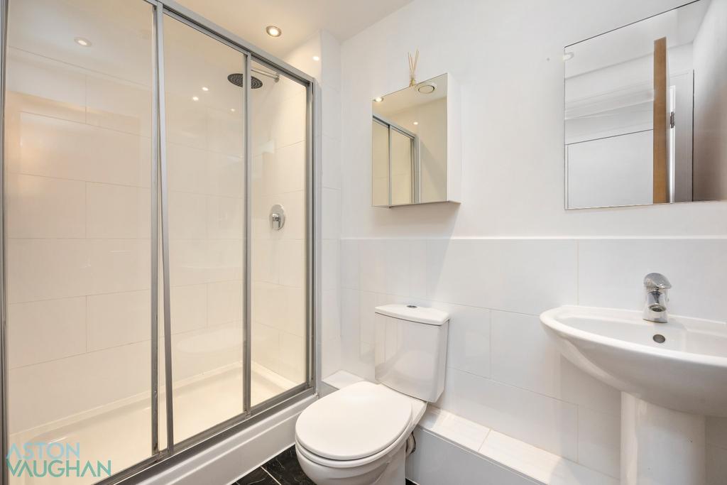 The apartment features two large double bedrooms, both with built-in storage, offering ample space for double-beds. These rooms are bathed in natural light from expansive windows, ensuring a bright and airy atmosphere. The master bedroom benefits from an en-suite shower room, while the main bathroom features a shower-over-bath. Both bathrooms are sleek and modern, with crisp white tiles and high-quality fixtures.
