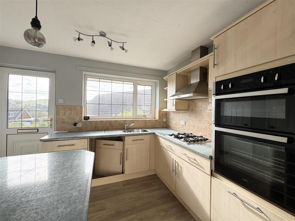 Kitchen - 3.33m x 3.38m (10'11" x 11'1") - This L-shaped kitchen is fitted with maple effect base and wall units with blue marble effect worktops, pale terracotta tiled splashbacks and a stainless steel one and a half bowl sink and drainer with mixer tap. There is space and plumbing for a washing machine and space for a tall fridge freezer. Cooking facilities comprise of a gas four burner hob with a stainless steel extractor fan over and a double electric oven. There are two large built-in cupboards perfect for storing household items, one of these contains the property’s central heating boiler. Wood effect vinyl flooring runs under foot and there is a spotlight bar and a further contemporary style light fitting which sits over the breakfast bar which could be used as an informal dining solution. A part galzed uPVC door leads out to the side of the property and a door leads into the hallway.