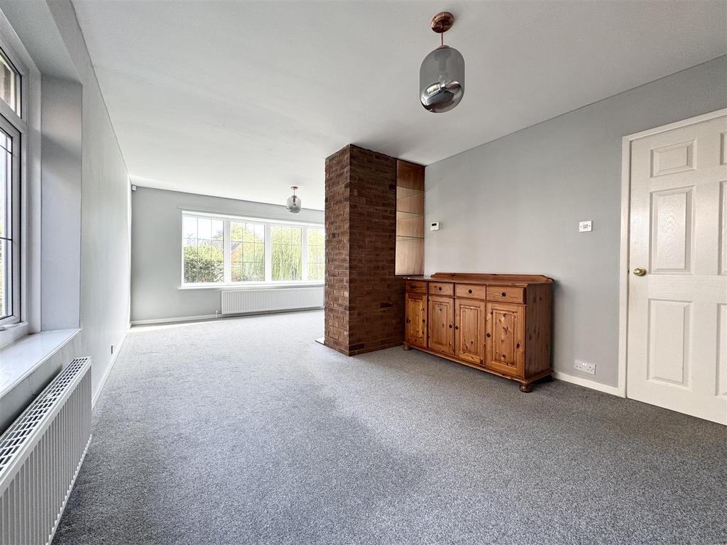 Living Room - 7.38m x 4.61m narrowing to 3.36m (24'2" x 15'1" na - Flooded with natural light from not only a large bay window which offers far reaching views to the front but also a large side window, this fabulous L shaped living room has a lounge area and also a separate dining area. A brick chimney makes a focal point in the room. The room is decorated in grey tones with grey carpet underfoot and modern copper and smoked glass light fittings to the ceiling. Doors lead to the porch and the hallway and a carpeted staircase with a timber balustrade ascends to the first floor.