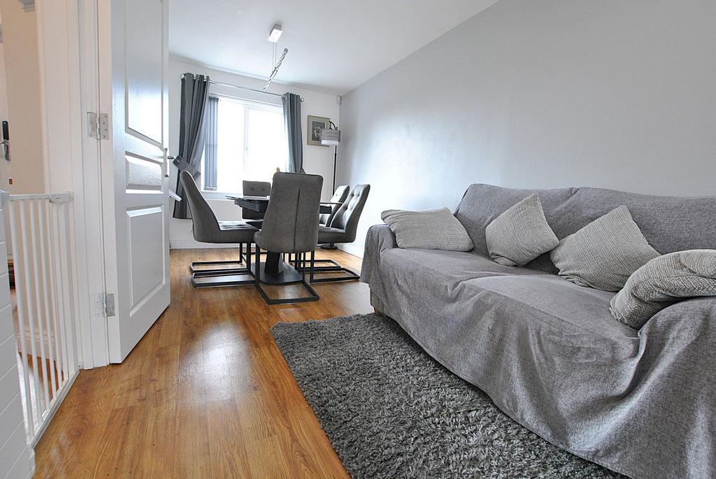 A superb, recently refitted, modern family space, which the current owner has reconfigured to now provide a great social space. To one end is space for a large family dining table, with window to the front aspect overlooking green space. There is a sofa seating area in the middle of the room. The rear of the room is the kitchen, which is fitted with a range of white gloss full height, wall and base units, with stone worksurface over and 1½ bowl composite sink and drainer inset with mixer tap over. Eye-level oven, separate microwave combi oven and warming drawer. Five ring gas hob with extraction unit over. Integral fridge/freezer, dishwasher, washing machine and separate dryer. Wall mounted boiler concealed in one of the cupboards. Part tiled walls. Breakfast bar seating area, and wood effect flooring throughout. Window and glazed double doors leading to the rear garden and paved patio area.