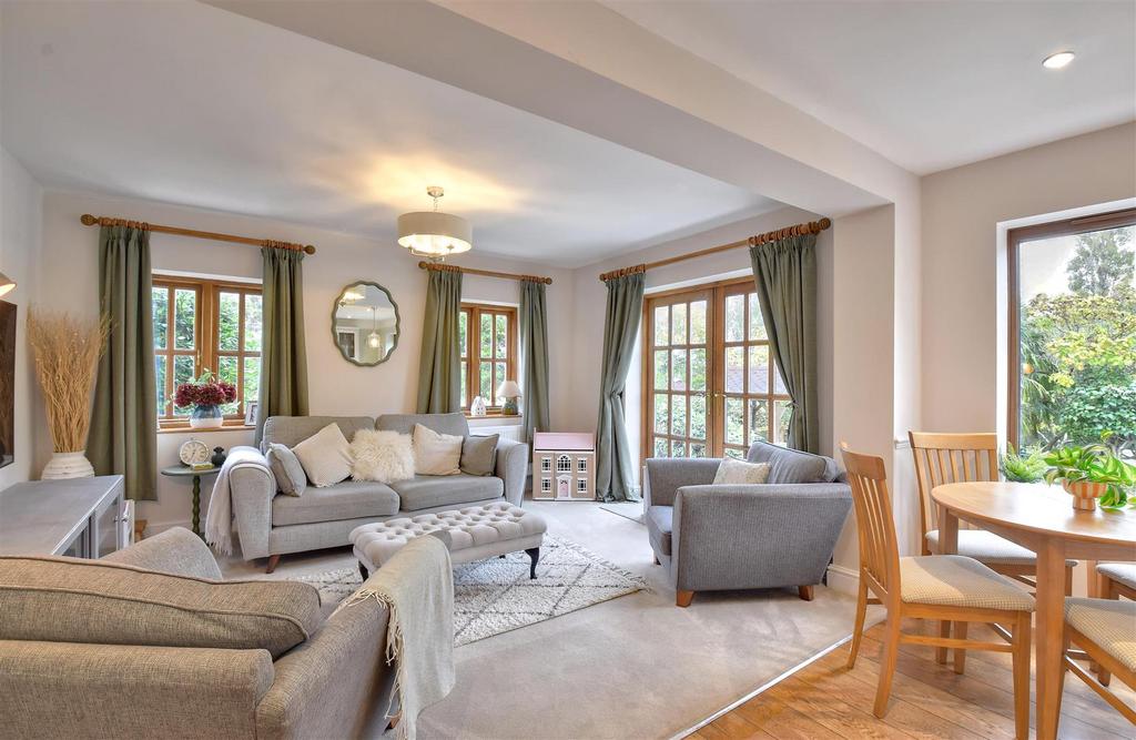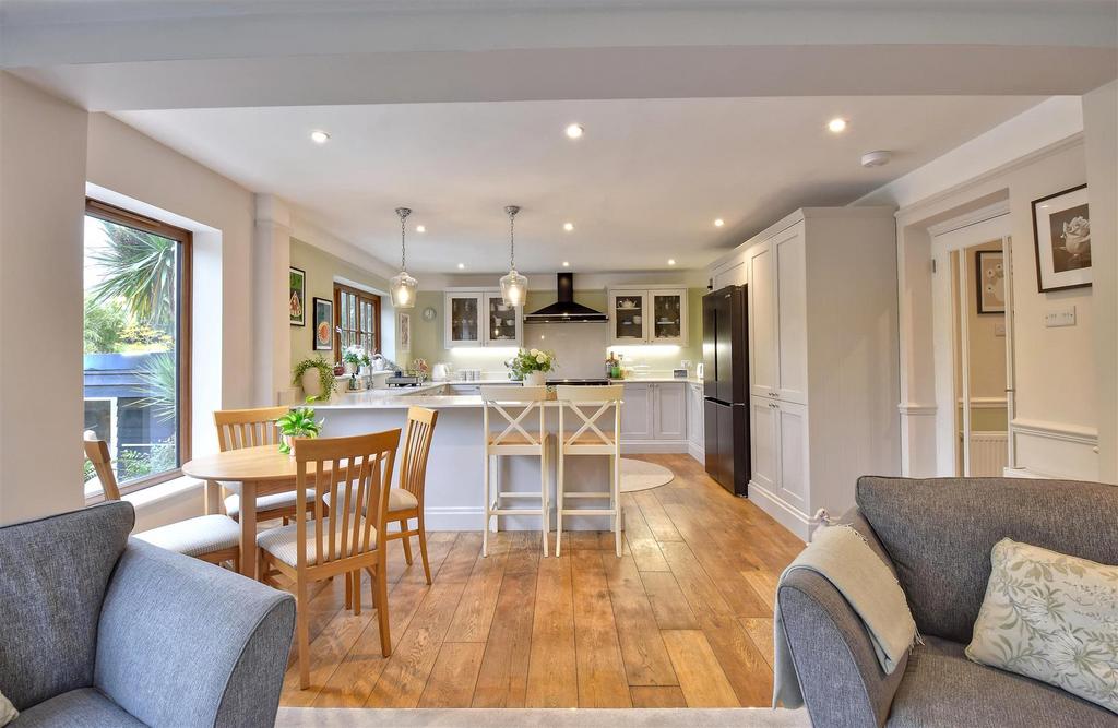 Kitchen/Dining/Family Room - 8.76m x 4.19m (28'9 x 13'9) - Impressive double aspect open plan space with a range of windows to the rear and side elevations, glazed double doors allowing access onto the garden, two fitted radiators, space for table and chairs, the kitchen area is extensively fitted with a range of grey shaker style cupboard and drawer base units with glazed wall mounted cupboards, complimenting white quartz worktop surfaces with matching splashback, inset one and a half bowl ceramic sink unit, space for range style cooker with quartz splashback and extractor canopy above, integral Bosh dishwasher, space for American style fridge/freezer, fitted double larder cupboard, fitted wine rack, fitted breakfast bar, wooden flooring.