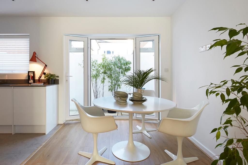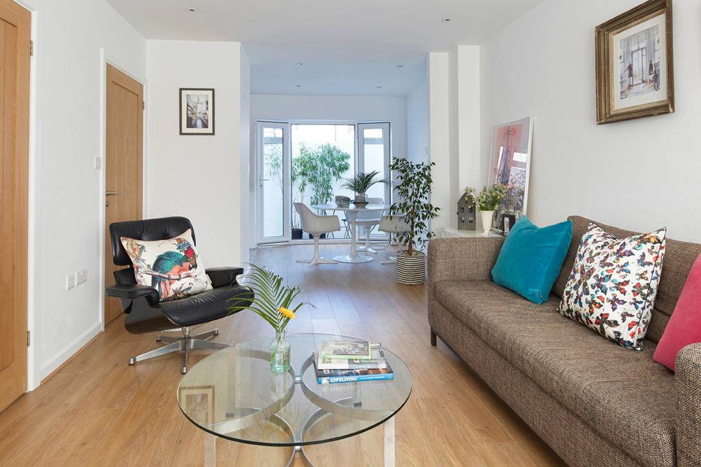 A four bedroom, terraced house located in a private gated mews, Brighton. The ground floor has an open plan living-kitchen room and a cloakroom. A rear courtyard is accessed from the kitchen area. The first floor has three bedrooms and a bathroom and the upper level has main bedroom with en-suite and there is access to a roof terrace. Outside there are communal gardens and off street parking for one car.