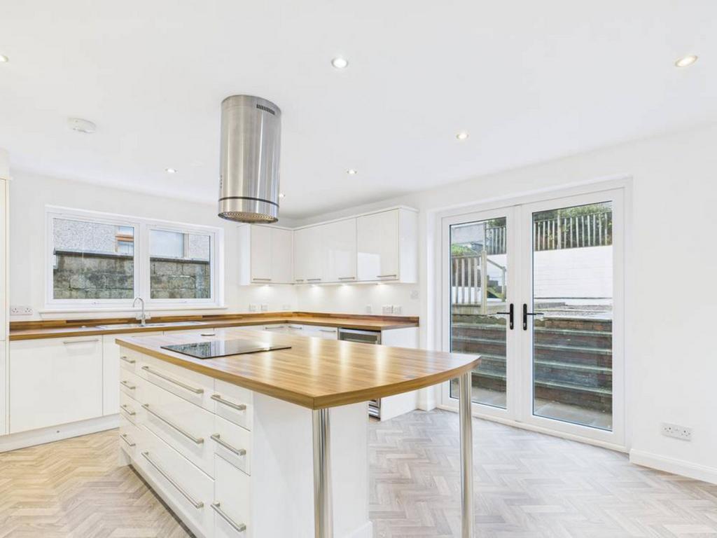 The kitchen/dining area is a true showstopper. With stylish cabinetry, generous work surfaces, and a central island housing an induction hob, this space is designed for both cooking and socialising. Patio doors open directly onto the garden, enhancing the indoor-outdoor flow. The kitchen also features a double oven, American-style fridge freezer, wine cooler, dishwasher, new flooring, and ample lighting and heating.