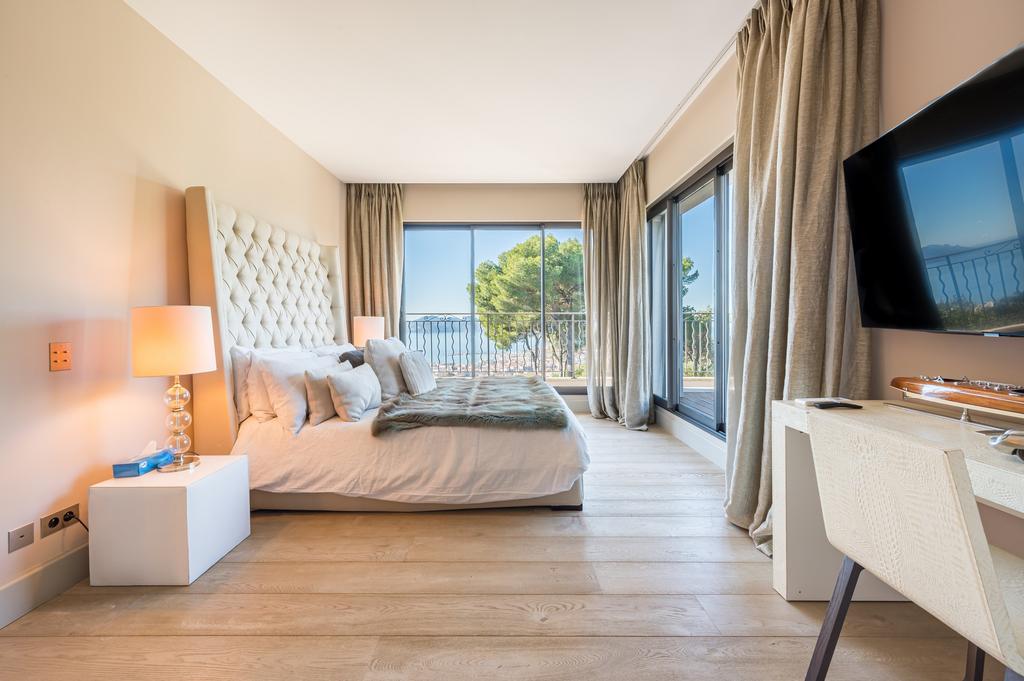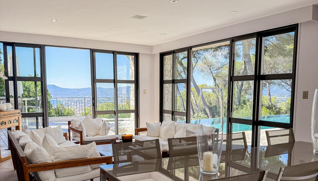 Alliant élégance contemporaine et charme intemporel, la villa se distingue par ses parquets en bois noble, ses tissus raffinés et ses larges baies vitrées offrant une lumière naturelle abondante et des vues spectaculaires sur la Méditerranée. Le rez-de-chaussée abrite un vaste espace de vie ouvert comprenant salon, salle à manger et cuisine, s’ouvrant sur la terrasse principale surplombant les jardins et la mer.