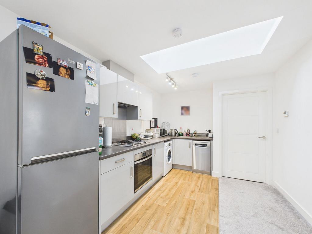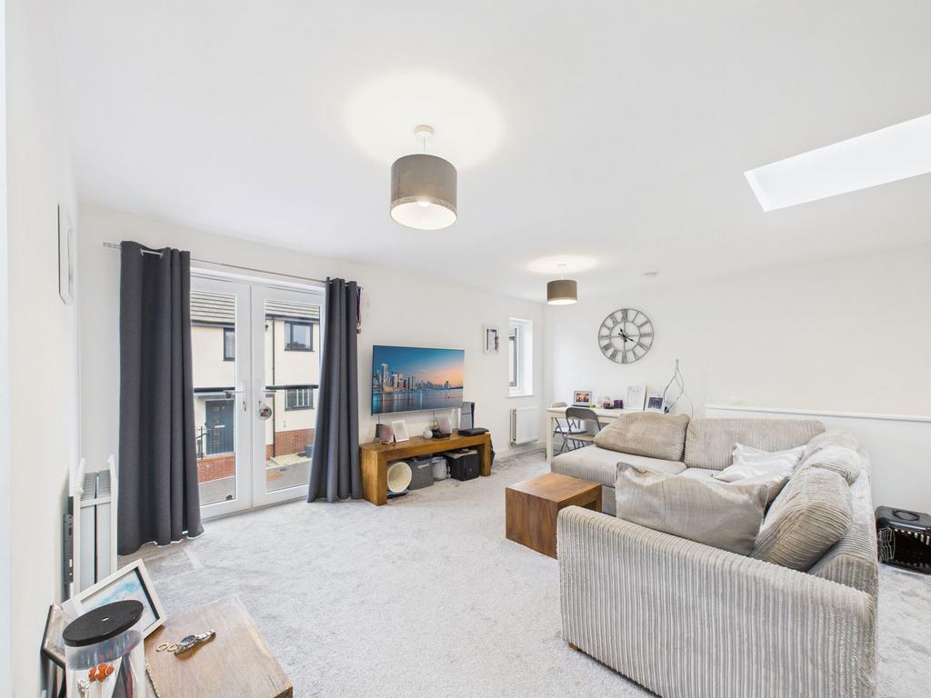 The living/dining area provides ample room for both relaxation and entertaining, with uPVC double glazed French doors opening onto a Juliet balcony, a further uPVC window, two Velux windows, and two gas central heating radiators.