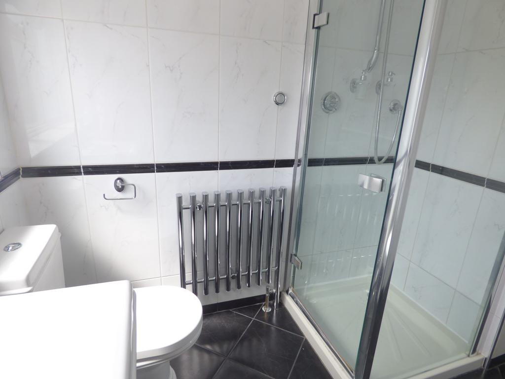 Door from Landing, UPVc obscure double glazed window, panelled bath, low level w/c, pedestal hand basin, enclosed shower cubicle, fully marble effect porcelain tiled walls and flooring, electric radiator