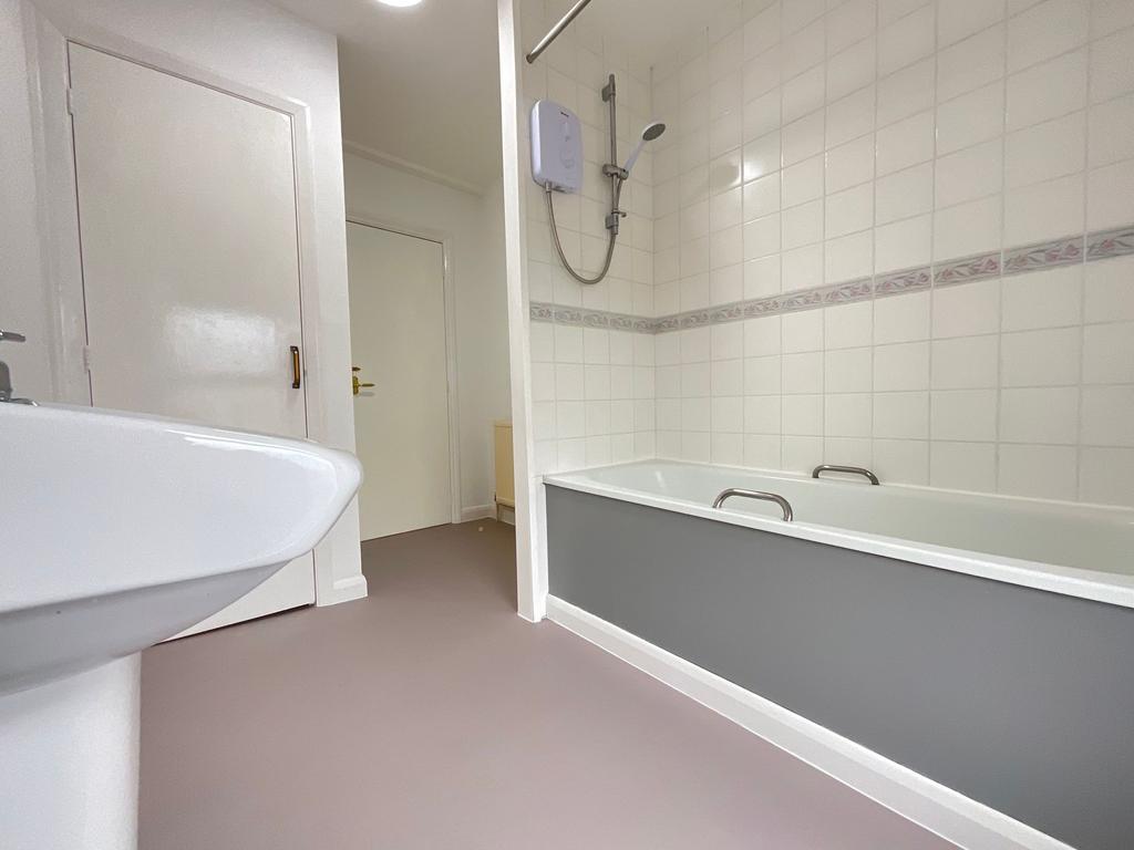 Dimensions: 10' 9''max x 6' 10'' (3.28m x 2.08m). White suite comprising of wash hand basin and bath with electric shower over, window to front, cupboard.