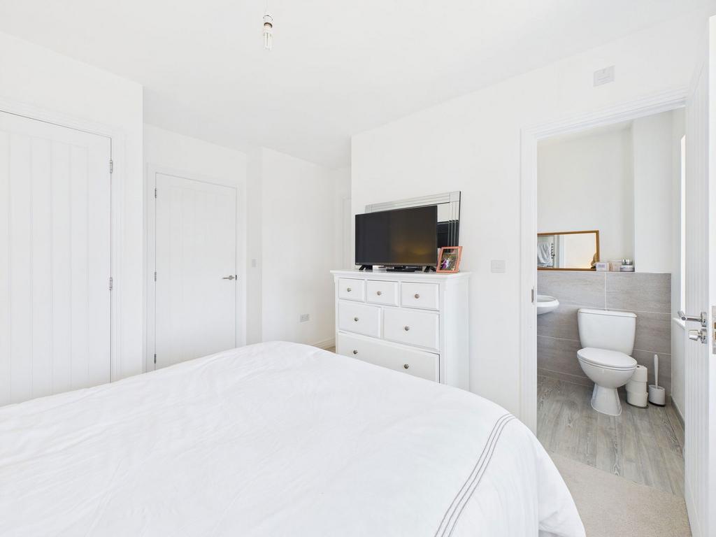 The front door opens into a welcoming entrance hall, offering access to a ground floor WC, a useful storage cupboard, and a door leading into the modern kitchen/breakfast room. This stylish space features sleek white units, integrated appliances, a sink and drainer, and ample room for a dining table and chairs. A further door opens into the west-facing lounge, a bright and comfortable space with double doors that lead directly out to the rear garden, perfect for enjoying afternoon sun. Upstairs, the first floor hosts three bedrooms, including a generous primary bedroom complete with built-in wardrobes and a private en suite shower room. The family bathroom is well-appointed with a bath, shower attachment, wash hand basin, and WC.