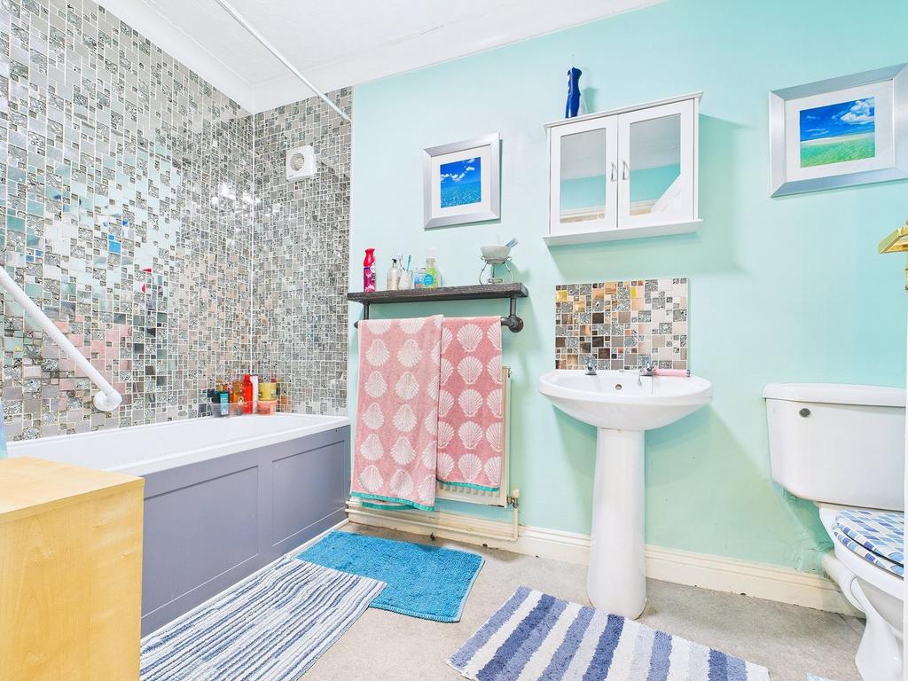 uPVC double glazed window to front, panelled bath with wall mounted shower and shower curtain over, wall mounted double panel radiator, w.c., pedestal handwash basin, textured and coved ceiling, extractor, lino style flooring.