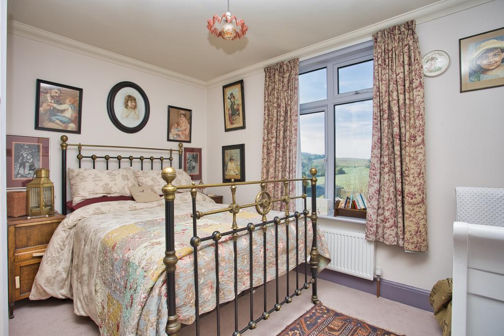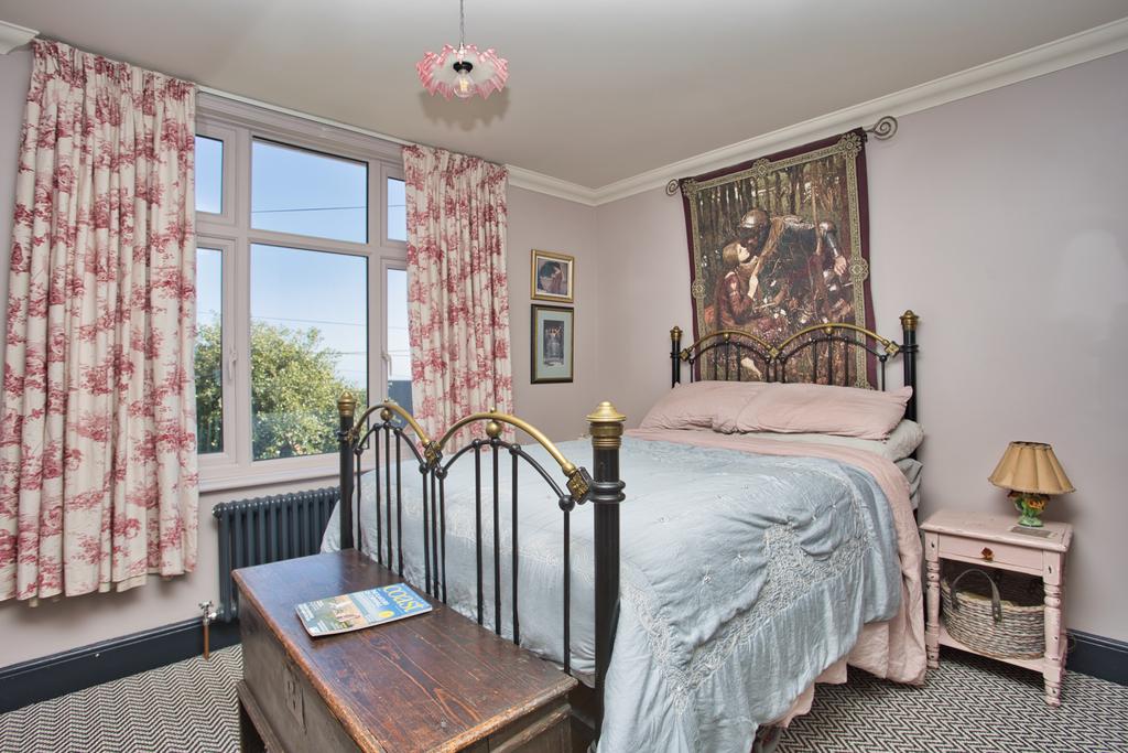 Double, radiator, restored fireplace, and a cupboard housing the water cylinder and linen storage. Window overlooks the garden.
