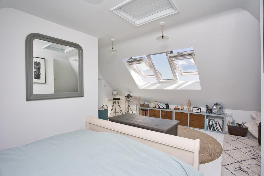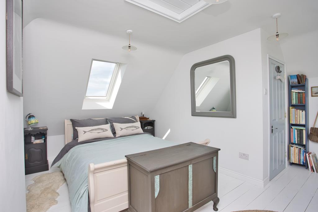 Stairs lead to a versatile upper hallway with desk space and additional storage. The loft bedroom has Velux windows with integrated blinds to both front and rear, capturing sea views to the front and fields to the rear. Eaves provide ample storage. Wooden flooring throughout.