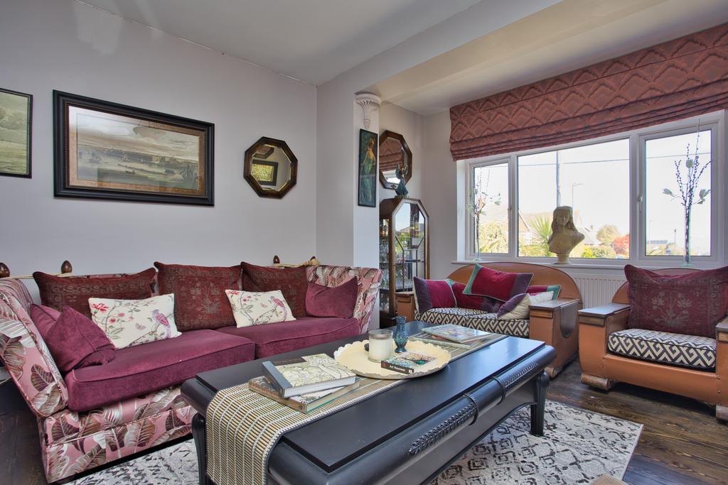Open fireplace with tiled surround, column radiator, and wooden flooring. Double-aspect windows to the front and side.